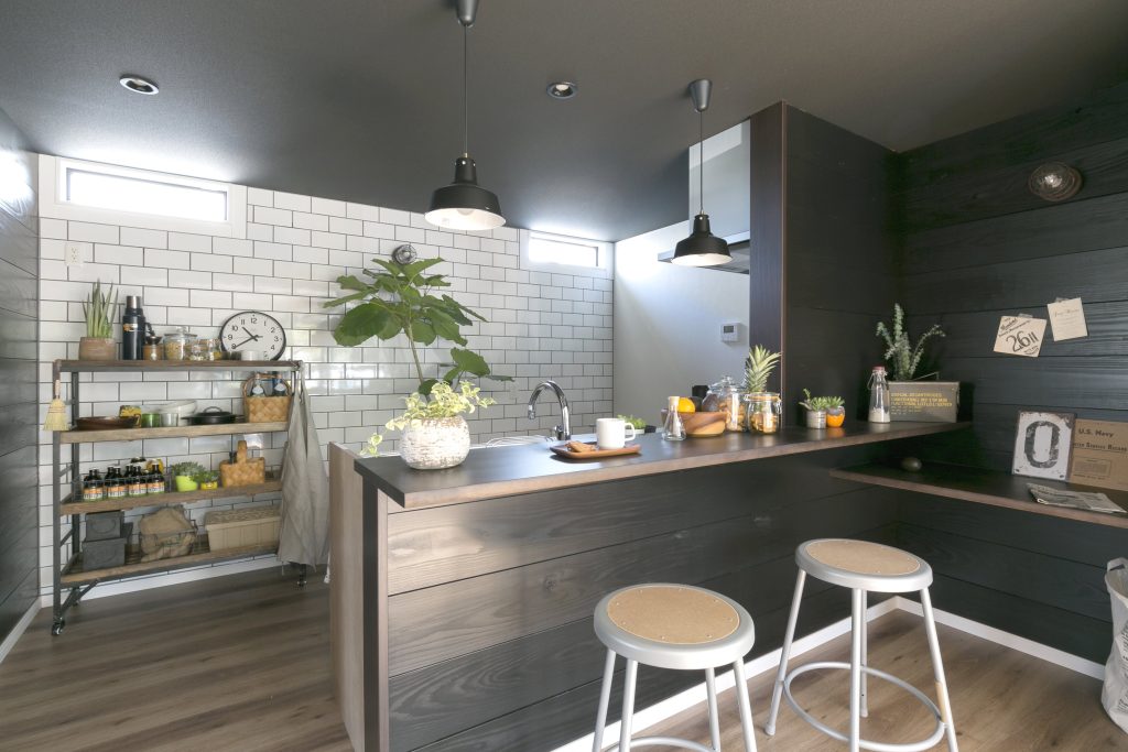 ヘリンボーンや無垢板張り、サブウェイタイルが貼られたキッチン、家のどこを切り取ってもフォトスポット間違いなし!