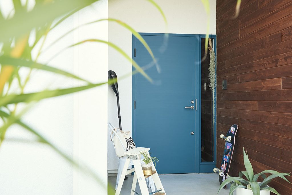 前面に広がるウッドデッキの横を通り抜けると、鮮やかなターコイズブルーの玄関ドアが迎えてくれます。