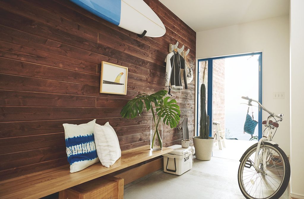 外部からつながる木の壁には、趣味のサーフボードや自転車を掛けたり、絵を飾ったり、そこは好きなものであふれる大人の秘密基地として楽しめます。