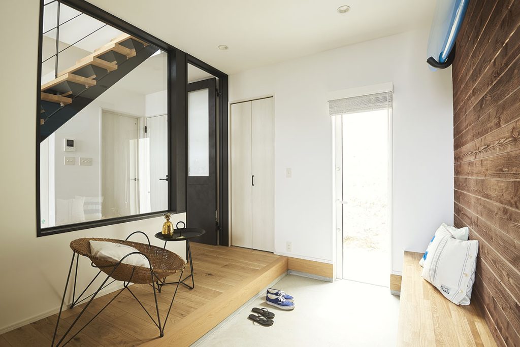 エントランス正面にはリビングにつながるガラスの大きな室内窓。