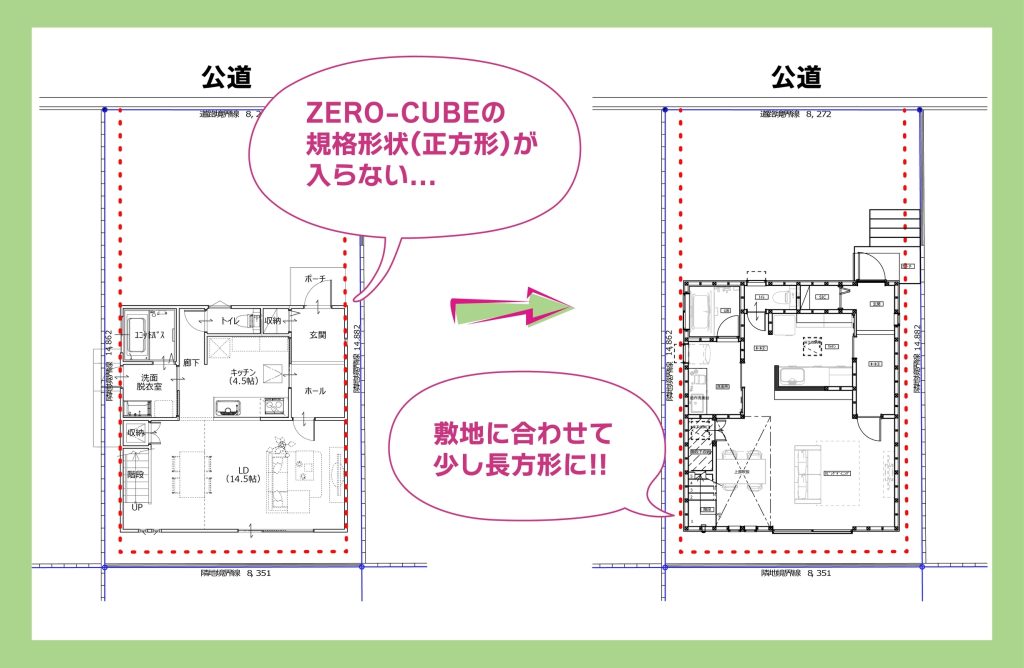 広い土地が少ないエリアでは規格形状が入らないことがよくありますので、弊社では規格住宅をベースに、敷地条件に合わせたプランをご提案しています。