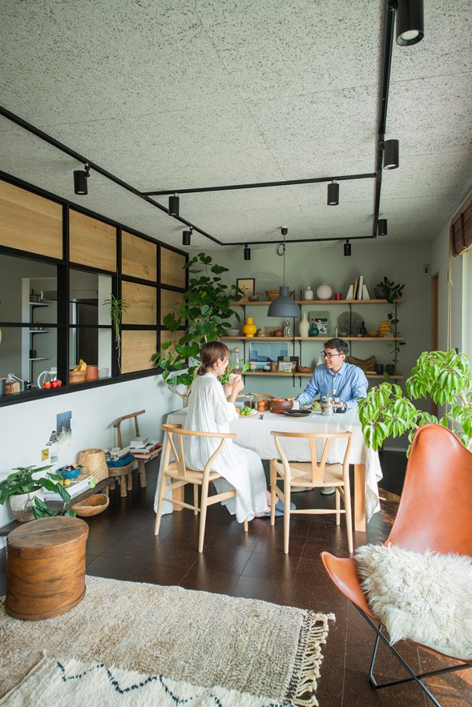 ぬくもりを感じるコルクタイルの床で、リビングと一体になったダイニング。キッチンとの仕切りにはナラ材パネルを使用。ナチュラルな風合いにパネルフレームと照明レールの黒でアクセントをつけ、カフェを思わせる空間に仕立てました。