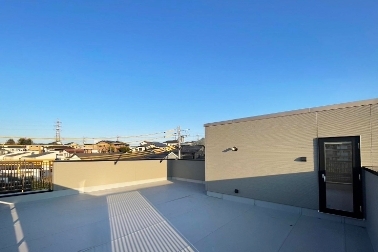 スカイバルコニーは見晴らし抜群。 リビングよりも広いこの場所、お子様の遊ぶスペースや洗濯物を干すスペース、ガーデニングスペース等、なにに使おうかワクワクです♪