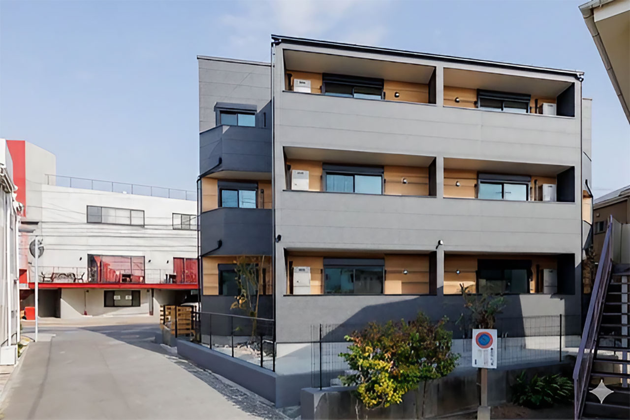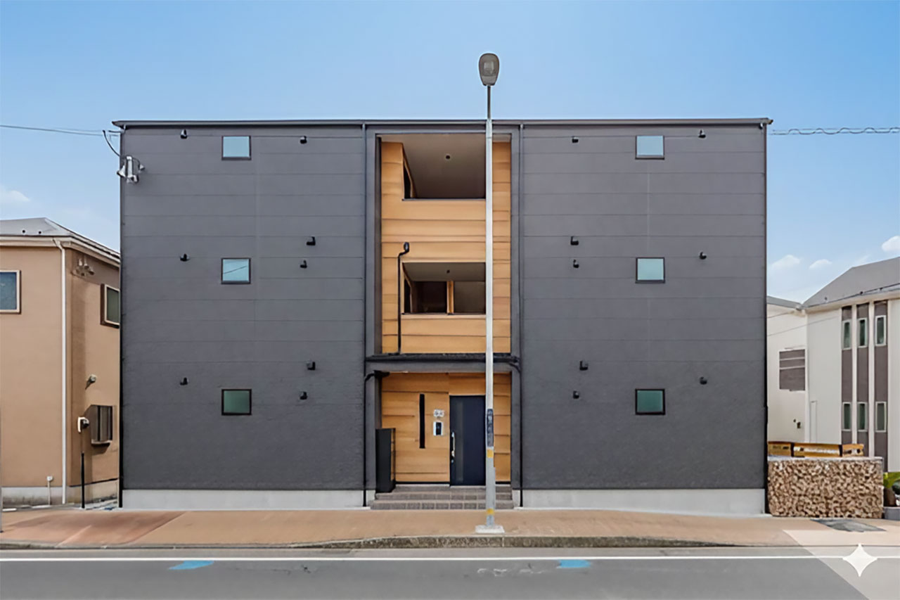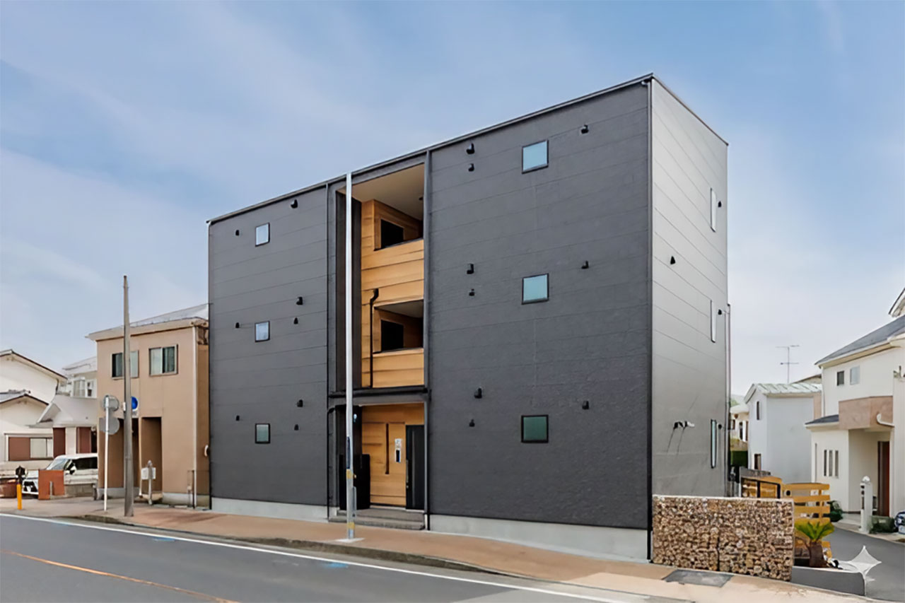 茅ヶ崎駅より徒歩の鉄砲通り沿いに面した準耐火3階木造マンションです。外壁はブラックを基調としたサイディングを使用して、共用部には木目サイディングを使い自然との共存をテーマとしています。内装も施主様のお気持ちを取り入れて賃貸競争にも勝ち得るデザインとなっています。1LDKでありながら新婚様にも対応可能な間取りとなっています。